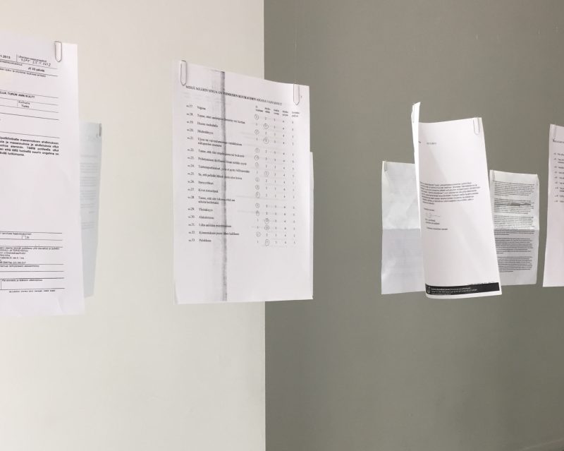 Valkoiset klemmareilla siimoihin ripustetut A4-arkit roikkuvat silmien korkeudella siisteissä riveissä. Niissä on tekstiä ja joissakin pieniä leikattuja reikiä, poistettua tekstiä. Olennaisin löytyy luettavista teksteistä ja rivien välistä.