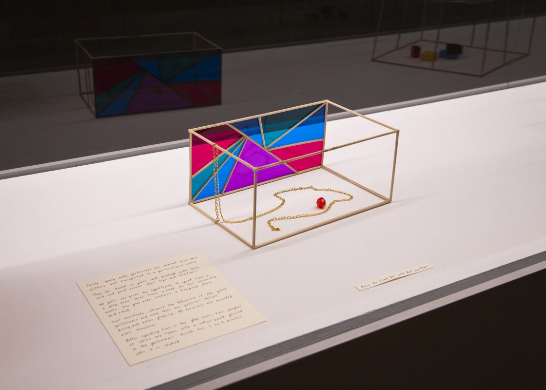 Viljamakasiinin keskikerrokseen ripustetussa teoksessaan Anthology of Performance Pieces for Animals (2018) Richard Ibghy ja Marilou Lemmens ovat rakentaneet eräänlaisia pienoismalleja erilaisista eläinkokeista. Vitriinin sisään asetelluissa riveissä on kirkkaanvärisiä pieniä rakennelmia toinen toisensa jälkeen. Rakennelmien vieressä on käsinkirjoitettu selostus siitä, millaisesta eläinkokeesta eli “eläinten performanssista” on kyse. Osa näistä oikeasti eri aikoina toteutetuista “eläinperformansseista” on harmittomampia, osa taas on julmempia. Eräässä niistä kaksi aasiannorsua vetelee narua saadakseen lentopalloverkon väistymään ruoan tieltä. Toisessa taas rotat seikkailevat ruoan perässä kolmiulotteisessa labyrintissä. Jälkimmäinen performanssi sinänsä vaikuta kovin väkivaltaiselta, mutta sitä on edeltänyt ja edellyttänyt väkivalta: 23 rottaa on menettänyt silmänsä ja viiksensä.