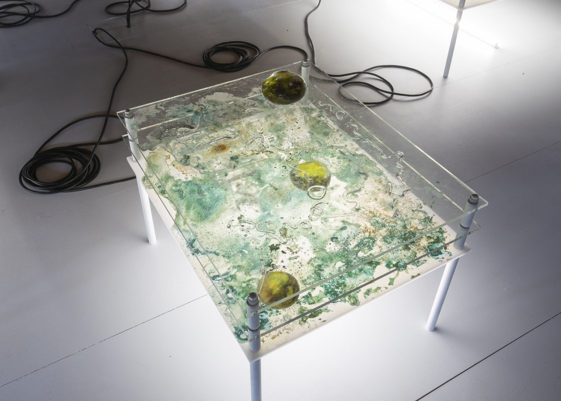 Vihreiden ja ruskeiden marmoroituneiden, roiskeisten ja täplikkäiden väriläiskien leikkiä voisi tuijottaa ikuisuuden. Samoin Lasismi-lasipajan Joonas Laakson puhaltamia orgaanisen kiemurtelevia, pyöreitä ja rinkulanmuotoisia lasiobjekteja. Lasin muodot herättävät ajatuksen siitä, että ne voivat muuttua minä hetkenä hyvänsä valuvaksi nesteenkaltaiseksi, venyä tai painua kasaan ja jähmettyä taas uuteen muotoonsa. Niistä ei oikein tiedä, katsooko jotain itselle tuntematonta kommunikaatio- tai merkkijärjestelmää, yksisoluisia eliölajeja vai elottomia lasiveistoksia. Teokseen kuuluu myös ääntä, jota ei pysty havaitsemaan ihmiskorvalla.