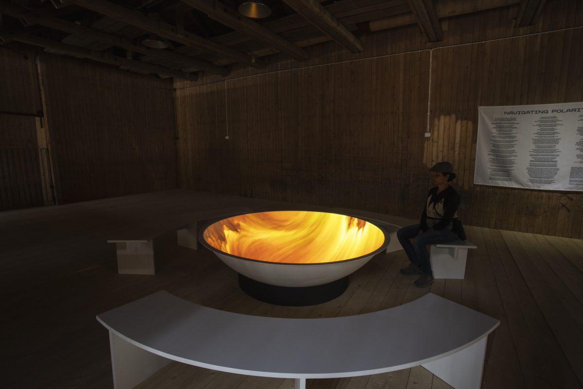 Fiskarsissa vanhan ruukin Puimalaan ja Viljamakasiiniin sekä alueen ulkotiloihin levittäytyvän näyttelyn voi ajatella alkavan joen yläjuoksulta ja laskeutuvan kohti alajuoksua. Marjolijn Dijkmanin videoinstallaatio Navigating Polarities (2018) on huima aloitus näyttelykierrokselle. Ylhäältä projisoidut vaihtuvat kuviot heijastuvat lattialle asetettuun suurehkoon satelliittimaiseen, puusta ja polyesteristä valmistettuun kupoliin. On hypnoottista katsoa erilaisia outoja symboleja, tähtitaivaita ja karttoja, tai itsekseen liikuskelevia muotoja.