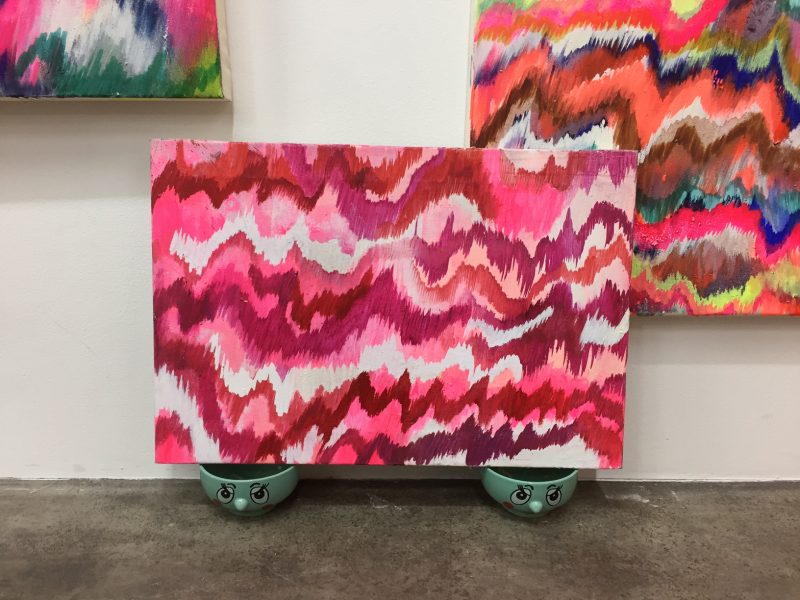 Teosten seassa huomion kiinnittävät myös solumaiset sommitelmat, jotka tuovat mieleeni pikkutarkoilla yksityiskohdillaan Yayoi Kusaman maalausten maailman. Vasta näyttelytekstiä luettuani hoksaan Eklundin pyörylöiden olevan pitsoja! Tietenkin! Täytevalikoima pitsoissa vaihtelee visuaalisesti mielikuvituksekkaalla tavalla. Pyöreiksi leikatut tai suorakulmaisiksi jätetyt pitsat rytmittävät ripustusta raikkaalla tavalla.