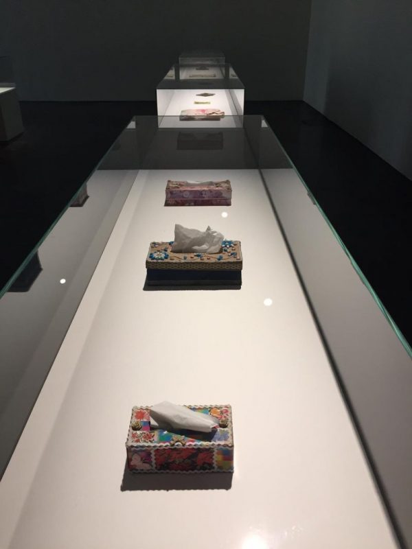Kontrasti suurten tummanpuhuvien veistosten ja vaaleisiin vitriineihin kauniisti aseteltujen sekä huolellisesti koristeltujen arkisten esineiden välillä on suuri. with history in a room filled with people with funny names 4 (house), (2017) esittelee Arunanondchain isoäidin Tipyavarna Nitibhonin (s. 1927) valmistamia esineitä vuosilta 1979-2017.