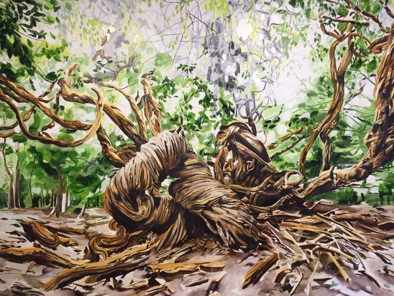 Teos Earth Keeps Rotating in Space (2018) on yhtä villisti kieppuvaa muotoa: puiden rungot, pinnat ja oksat sekoittuvat samaksi kieppuvaksi massaksi. Näkymä on kuin jatkuvassa liikkeessä – ja totta kai se myös on jatkuvassa liikkeessä. Puut ovat kasveja, ne ovat elämää. Ne eivät ole liikkumattomia vaan aktiivisia ja yhteisöllisiä toimijoita, joiden puuhista tiedämme itse asiassa yllättävän vähän.