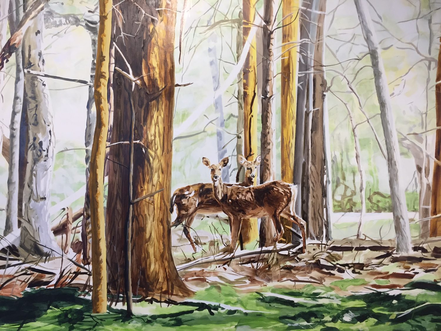 Teoksessa Shelter (2018) kannon pinta on mutkittelevaa, ruskean eri sävyissä valossa hohtavaa kaarnaa. Värit ovat täydellisesti yhdessä toimivia, yllättäviäkin yhdistelmiä: kaatunut kapea runko sammalesta kirkkaan vihreä, taustalla kulkeva joki, puut ja niiden väleistä avautuva tila kaikki samoja sinisen sävyjä. Siveltimenvedot ovat paksuja ja rajuja tai aavistuksen ohuita ja herkkiä, mutta jokainen niistä osuu kohdalleen niin, että niiden väliin jäävä tila tuntuu jatkuvan loputtomiin.